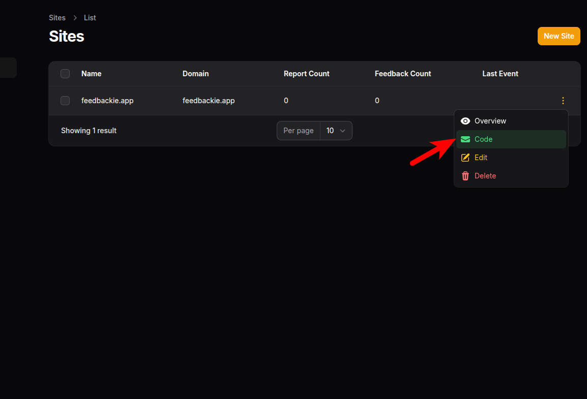 Integrating the tool into a website is quite simple. You just need to specify the HTML element identifiers where the text with information on how to send a bug report will be inserted, as well as where to insert the popup with a question about the article's usefulness in the code builder. Select the site in the admin panel, then click on the Code option in the context menu: